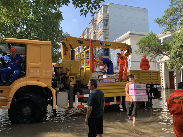 在暴雨过后,集团员工自发组成志愿者团队,连续多日参与新乡市高新区对外接收救援物资的分派点进行物资搬卸。